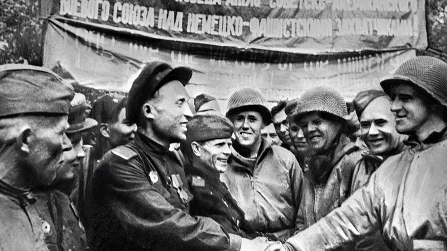 Soviet and American soldiers meet at the Elbe River in Germany on 25 April 1945
