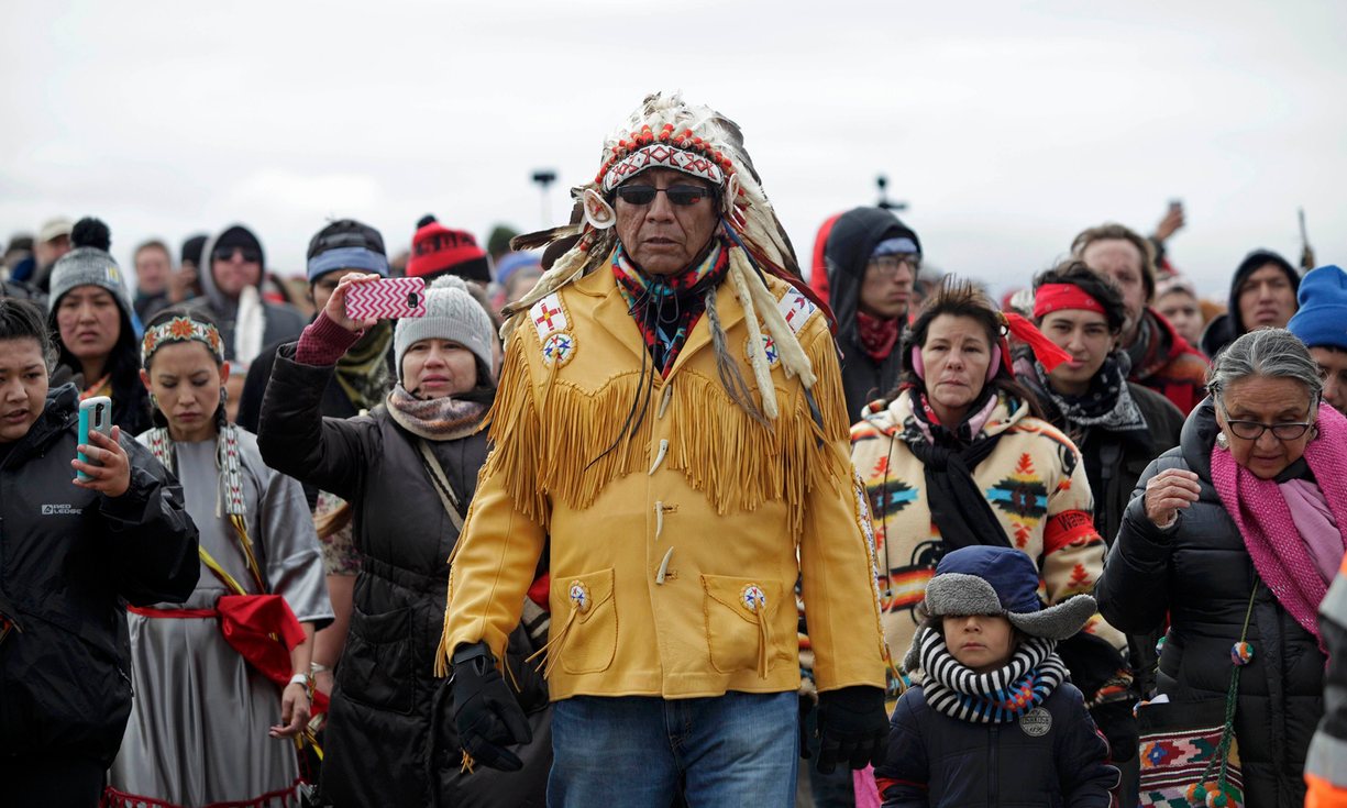 Chief Arvol Looking Horse, spiritual leader of the Sioux Nation, leads his people to peacefully pray near a law enforcement barricade just outside a Dakota Access pipeline construction site. Activists at the Malheur wildlife refuge in Oregon were carrying guns – but ‘if native people were armed, we would be killed,’ says an activist at Standing Rock. Read The Guardian story. Photograph: Stringer/Reuters